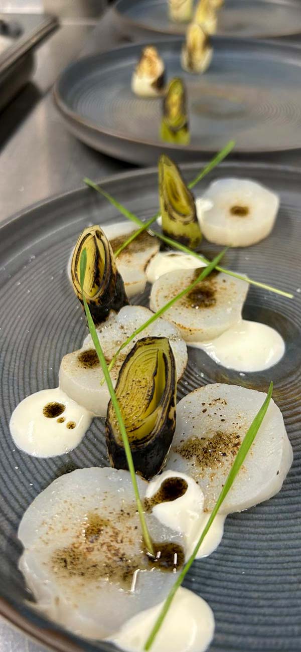 Noix de Saint-Jacques poêlées, persil tubéreux en purée et chips,